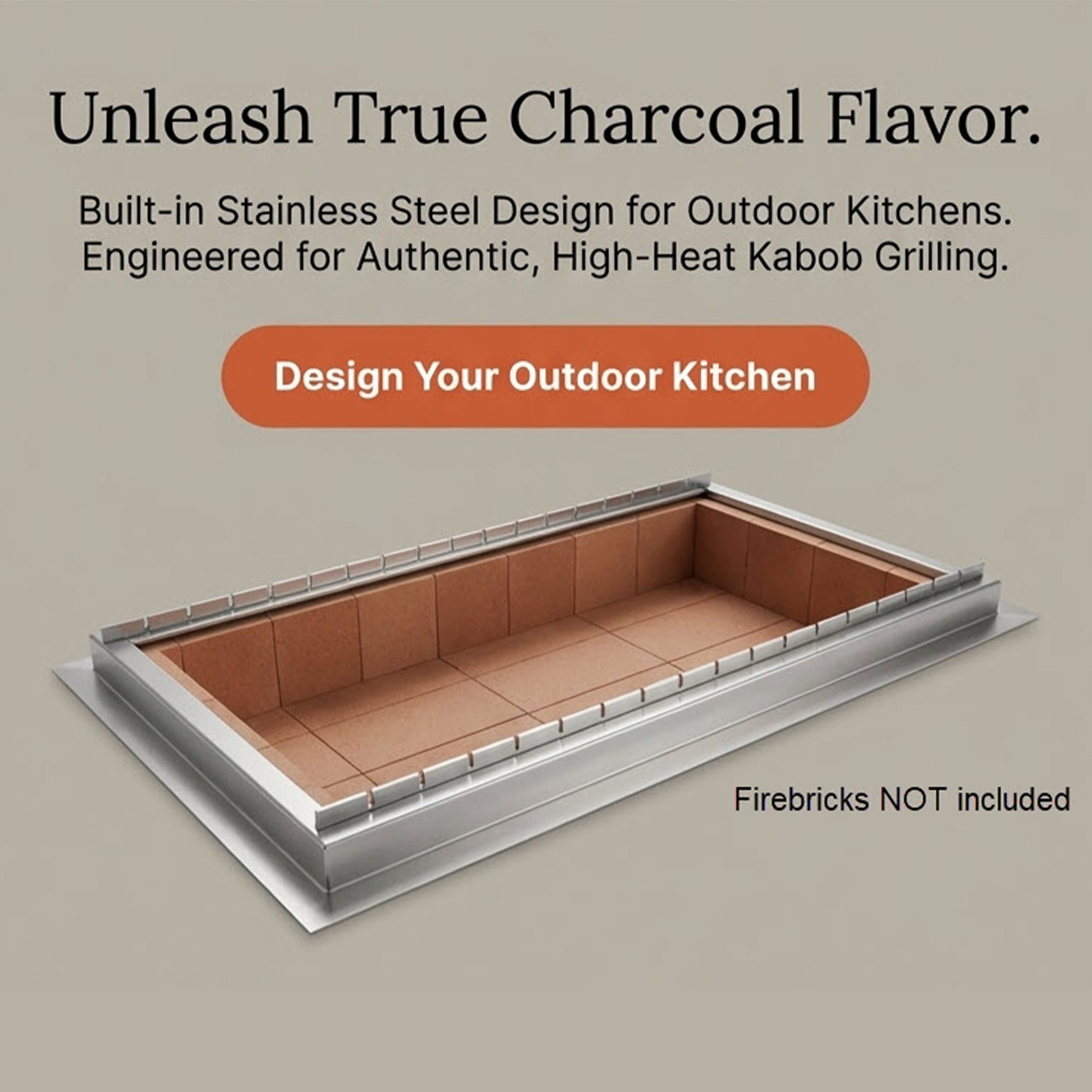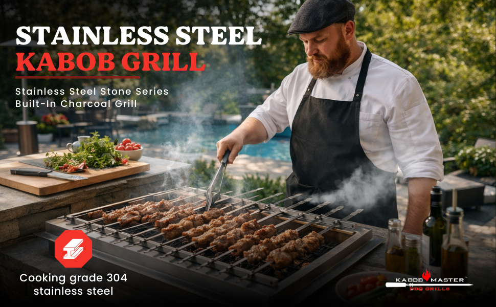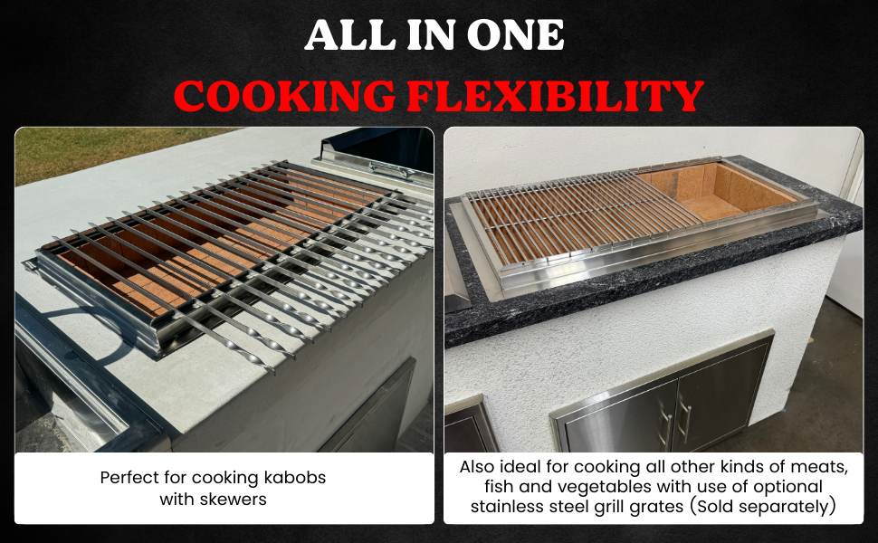 The KabobMaster Stone Series Grills are charcoal grills designed to be installed in outdoor kitchens and BBQ islands. The grills are designed to fit seemlessly within a countertop rectangular cutout as a “built in grill.” Once installed the grill must be lined with “fireproof bricks”. (Fireproof bricks not included).
